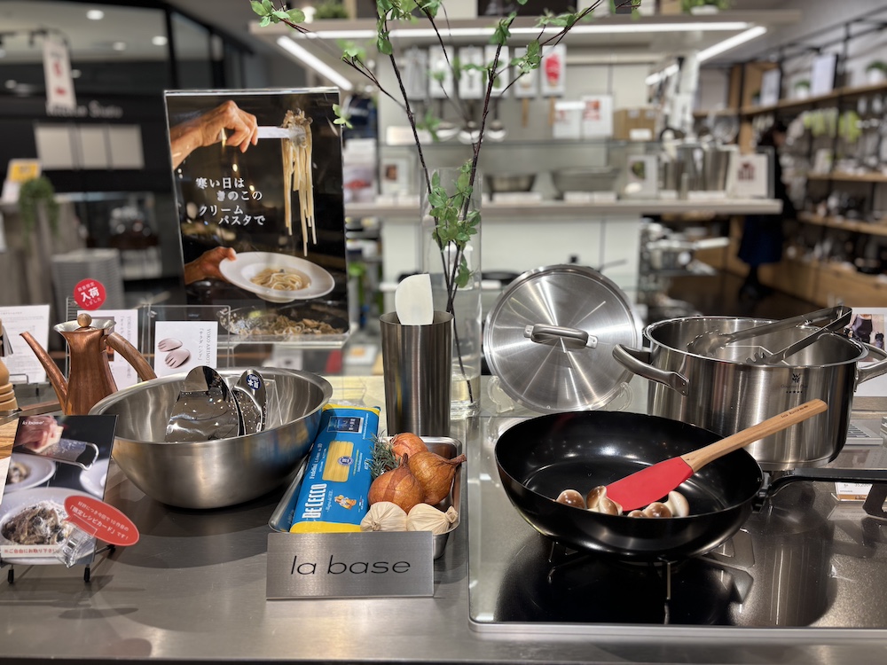 ラバーゼのトングやシリコーンヘラ、そしてYOKO ARIMOTOシリーズのオイルディスペンサーなどが並びます。